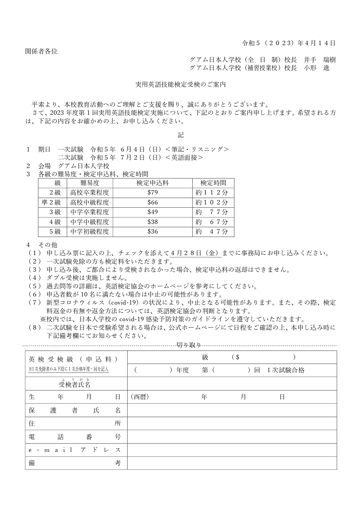 (グアム日本人学校)2023年度第1回 実用英語技能検定受検のご案内