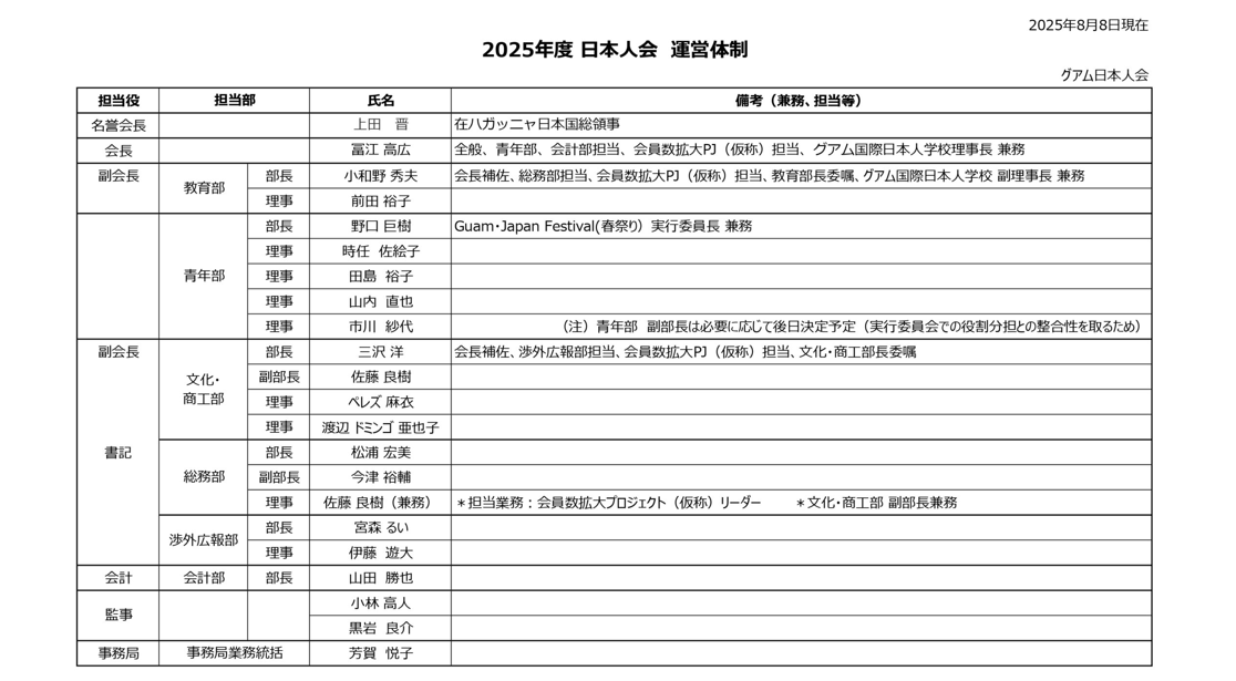 日本人会組織(2025年度 日本人会理事会名簿/敬称略)